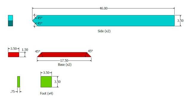 Corte 2 x 4 y 1 x 4 a la longitud como se muestra. Puede utilizarse una sierra de mesa o ingletadora para cortar los ángulos.
