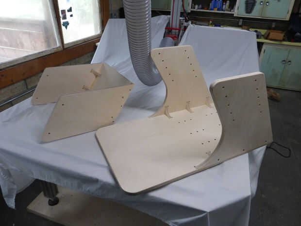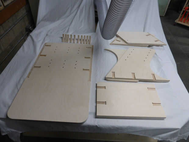 Las piezas cortadas se pueden recortar y lijadas antes de la Asamblea. Hay dos subconjuntos: menor incluye la placa base y las porciones más bajas de las tabicas, y la parte superior incluye la placa superior y las canalizaciones verticales superiores. Montar primero la parte superior, y luego usarlo como separador al ensamblar la parte inferior. Es difícil para tener en cuenta totalmente el espesor del material aún cuando corte en CNC, para su mejor montar la parte que anida dentro de otro y utilizarlo como una guía para las piezas exteriores. Las piezas fueron pegadas y atornilladas, luego deja para secar antes de un lijado de acabado final.