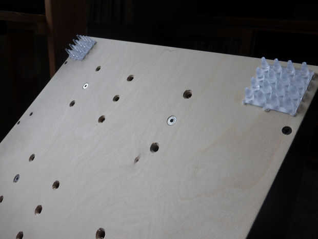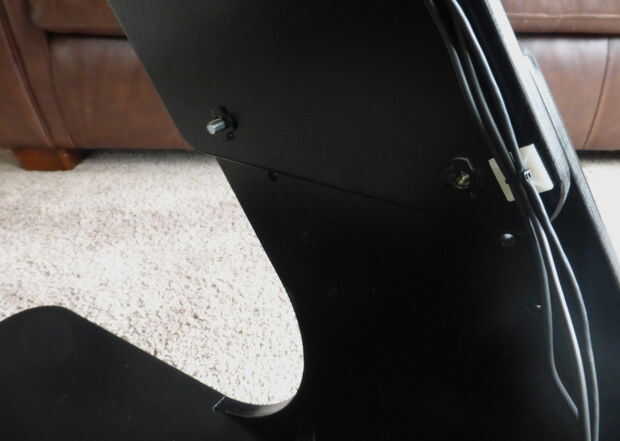 Encontré alfombra "no Mella" protectores para muebles y les instala - sobre todo esto era para que la placa base apoyar más firmemente en el suelo y no flota sobre la alfombra blandita. Los cables fueron encaminados por el interior de una de las bandas superiores mediante unos anclajes de cable adhesivo y zipties. No conecte los cables de la pieza inferior porque no quería causar problemas de cableado cuando colapso el soporte de rueda para su almacenamiento.