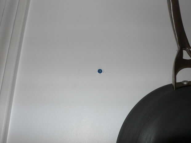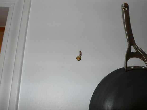 Mientras tienes el taladro hacia fuera, hacer algunos agujeros para tarugos. Esto es esencial-incluso una olla pequeña es pesada de tire un gancho limpio de yeso. Conducir un gancho de taza por cada ancla y se usa para apoyar sus cacerolas.