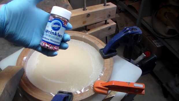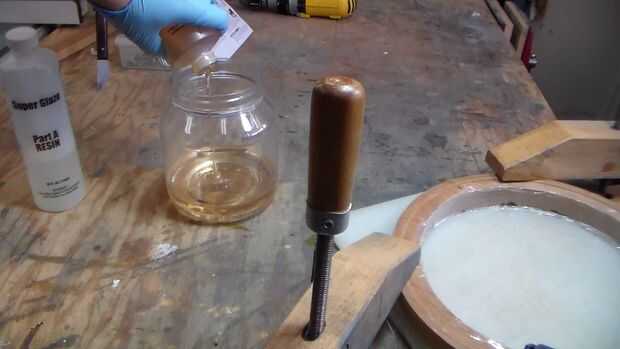 El molde para este casting fue una pieza desechada de un proyecto anterior. Sujeta a una tabla de cortar de polietileno de alta densidad que yo primero forrado con cinta de embalaje. Si no tienes un molde redondo y abundante cinta de embalaje, usted sólo echarían esto en una bandeja cuadrada. La desventaja principal de es tener que mezclar epoxi extra.