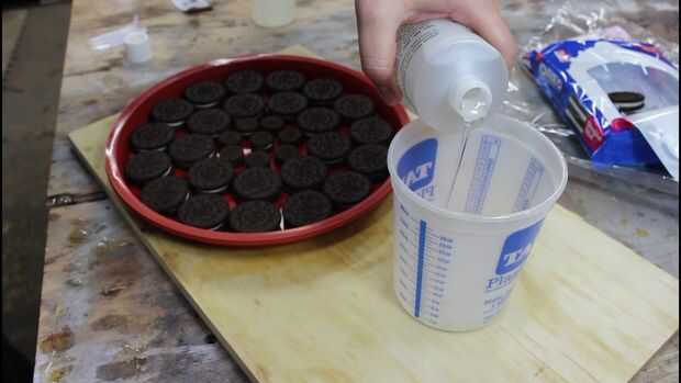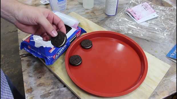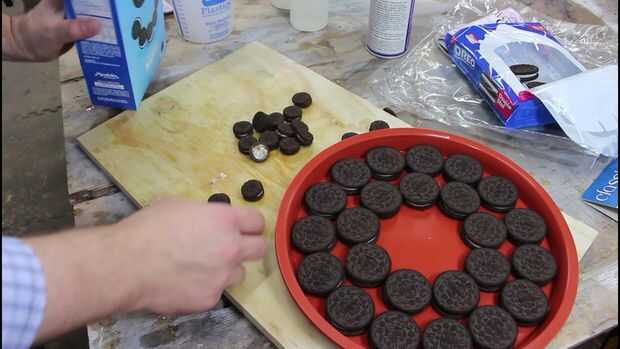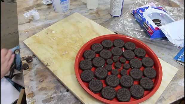 Empecé con un 11" pizza molde de silicona que compré en línea. Roció la silicona con desmoldante y luego comenzó exponiendo cosas doble OREOs en un círculo. Terminé cambiando a la mini OREOs para obtener mi círculo interno tan estrecha como sea posible. Si tienes algún problema con ver las galletas OREO encajonadas para siempre en la resina, la mirada ahora!!!!