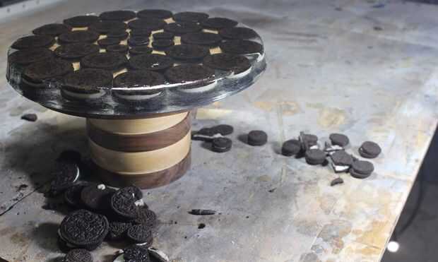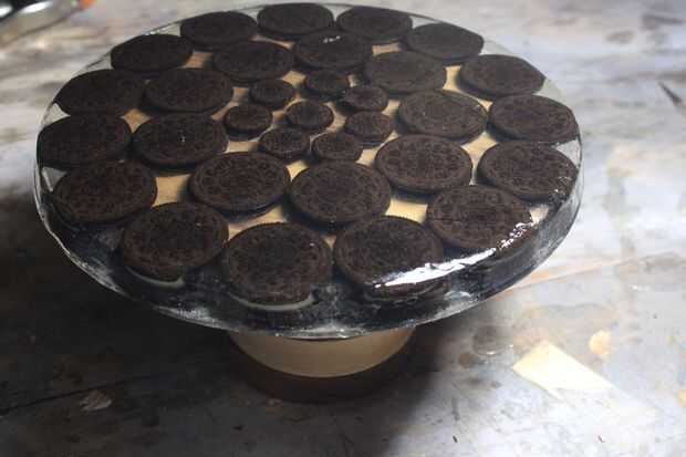 Después de tres semanas de curado tiempo de curado, he quitado del molde y ponerlo en la parte superior! Todo listo para la cocción de graves! Terminé no pegar arriba de OREO a la base de madera ya que le dio al usuario más flexibilidad. Podría entonces ser una placa o se pare. También reemplazar la resina con decir una placa de cristal daría la pieza una sensación más crecido si esa mirada fue preferida.