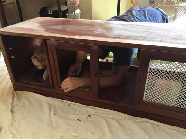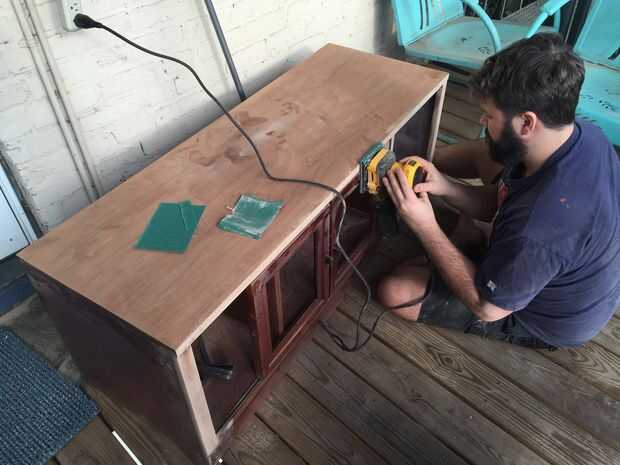 Use una lijadora eléctrica para eliminar el acabado del soporte de la TV. Se puede lijar la pieza de los muebles a mano si quieres, pero tardará mucho más tiempo. Después de que la arena, limpieza del mueble con un trapo húmedo para quitar el exceso de suciedad y el polvo.