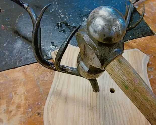he marcado y perforado los agujeros para los cuernos un poco más pequeños que las varillas de metal. después de presentaron y de las barras en cuatro pirámides de caras a que encajen en los agujeros mejor. Cuando yo les había presentado, yo les alineados y había martillado en el escudo.