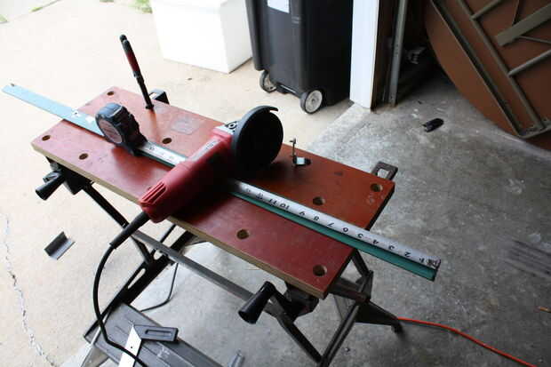 Yo uso mi caballo de batalla como una pinza y medir y cortar, medir y cortar. Es mucho más rápido y más seguro utilizar una sierra de corte, pero por desgracia, no tengo uno. Llegar a hacerlo de la manera dura con un disco de corte en una esmeriladora. Yo Marque la longitud, utilizar la plaza para hacer mi línea de corte, corte el lado primero y luego la parte superior. No vinculan a la rueda! Se fundirá aparte en diminutos trozos de metralla que puede encontrar fácilmente su camino dentro de su cuerpo.