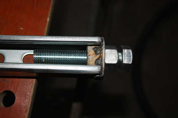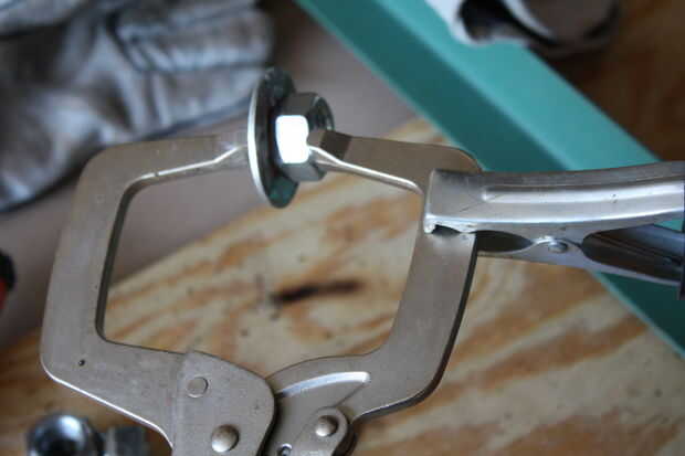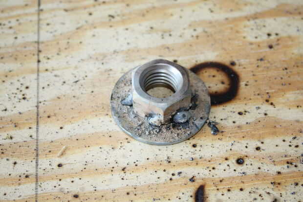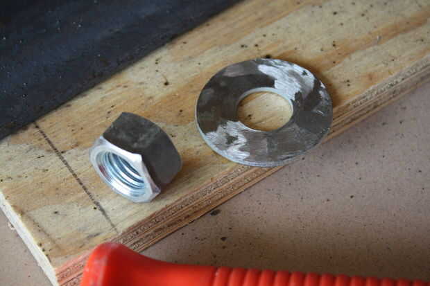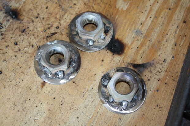 Empecé por la soldadura de la tuerca con la arandela, tratando de mantenerlo más centrado posible. Las abrazaderas de tornillo son muy útiles aquí. Acabo de poner un punto de soldadura en cada lado de la tuerca, para soldaduras de 6 puntos por el combo de la tuerca/arandela.