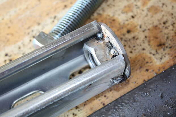 La Asamblea de la tuerca/arandela se inserta en el extremo de la pata unistrut, lado de la tuerca hacia arriba. Soldadura de la base de la pierna a la lavadora.