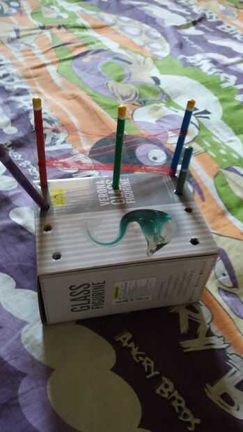 2. Tome un tamaño suficiente cartón para libros. Hacer 9 hoyos en él. Tomar 5 lápices y ponerlas en los agujeros como se muestra en la imagen.