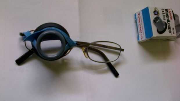 Mantener unida la lupa y anteojos, traer la banda de goma alrededor de la lupa como se ve en la foto. Lo siento si no está demasiado claro. Cada lado de la banda se desliza sobre y al lado opuesto de la lupa, de tal modo sosteniendo la lupa en su lugar.
