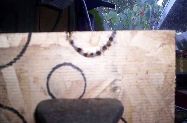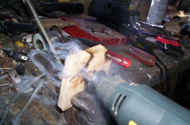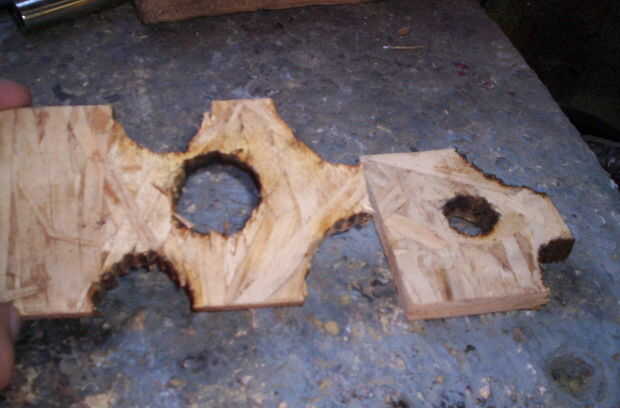 Para hacer los cortes comienzo comienzo la pieza A en la abrazadera. A continuación, haga una serie de agujeros en las marcas de rotulador permanente. Deben estar separados unos milímetros. Es donde se pone complicado y peligroso tipo de. Usar el taladro como una sierra y fuerza de un agujero a otro. Recuerde mantener la broca perfectamente perpendiculares a la madera. Utilice una broca grande y fuerte y atento a las brasas calientes y humo. Probablemente tengas una mejor idea de cómo hacerlo así que lo publique en los comentarios y voy a poner aquí! Tengo a un poco creativo.