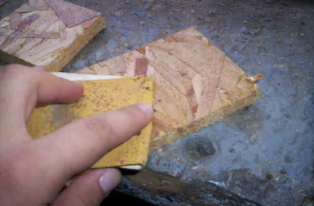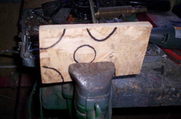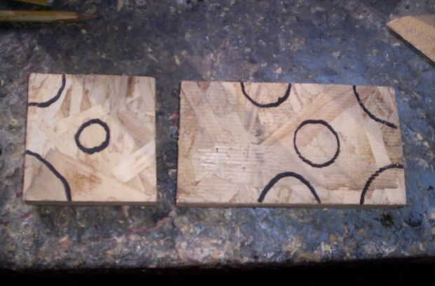 Ahora bien, tome el papel de lija y lijar hasta que estén casi perfectamente lisas. Te recomiendo grano 40. A continuación marcar las piezas con la permanente como sembrado en las fotos. Usé algo redondo, como un zócalo de la bombilla que tenía de una bombilla rota, pero se puede utilizar una tapa de la botella. El aspecto de queso suizo realmente no sirve, así que usted puede cortar en cualquier forma artística que le guste. Pero asegúrese de hacer el agujero en el centro de la pieza A servir como un lugar para poner la bombilla.