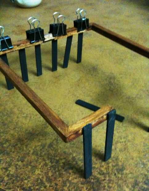 Ahora empezar a pegar y su palillos popsicle en el bastidor de sujeción. luego una vez seco... pegamento y abrazadera para el marco de otros con la madera contrachapada.
