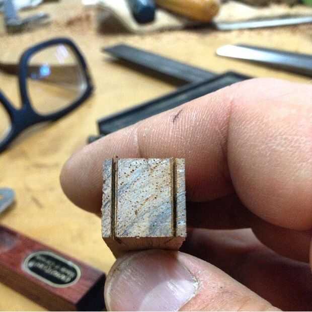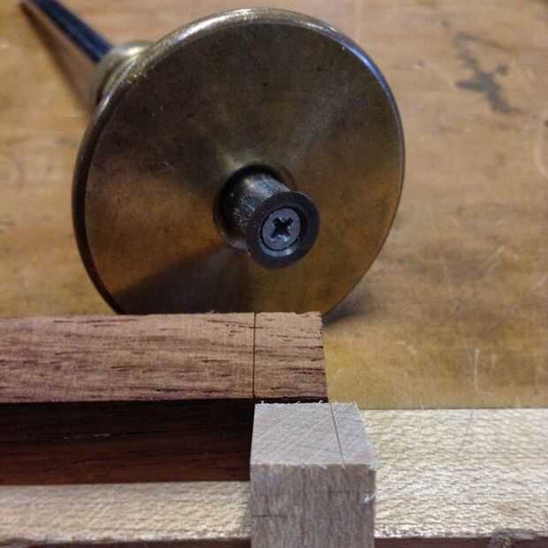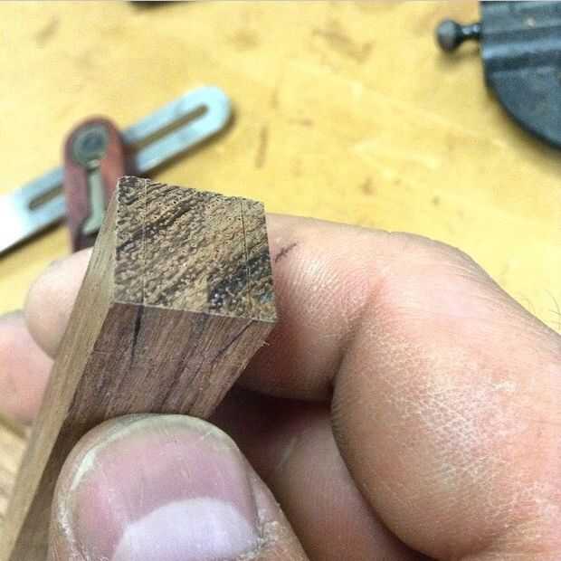 Estoy usando un media cola de pato ciego en la parte superior para la fuerza y porque se ve bien con las maderas contrastantes. Utilizando un gramil, exponer la profundidad de la cola alrededor de la pieza de cola (Asegúrese de que es cuadrada) y en el contrahilo de los lados del marco donde se cortará la toma.