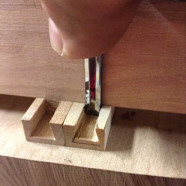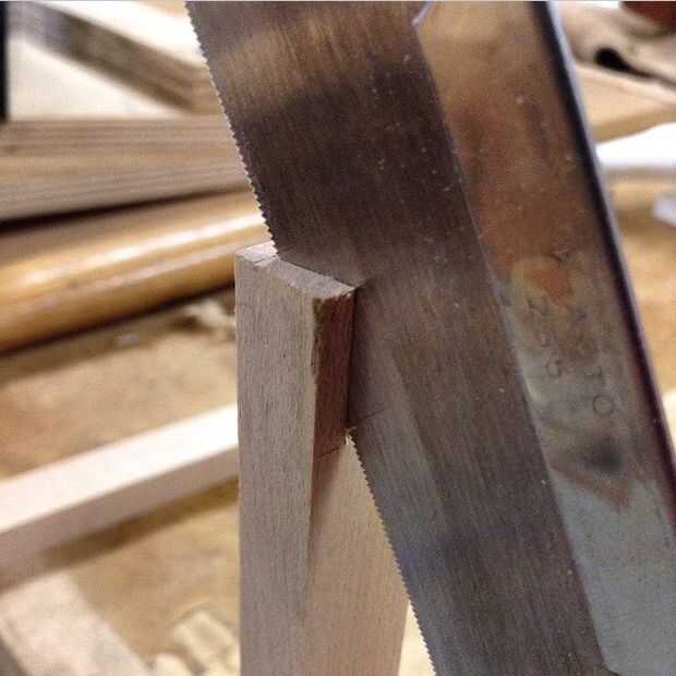 Sierra en un ángulo en el lado inútil de las marcas de diseño hasta la sierra sólo alcanza las líneas de diseño. A continuación, cree un pequeño resalte con un cincel para actuar como una guía para un bloque que taja encima de las piezas de sujeción. El bloque guía la parte posterior del cincel ángulo recto hacia abajo en la articulación un poco a la vez. Después de cada tajada suave puede ser agrietado un poco más material de los residuos de madera dentro de la articulación. Alternar lentamente hacia adelante y hacia atrás hasta llegar a la línea de diseño.