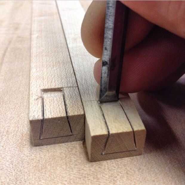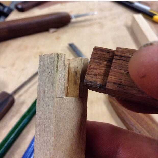 Para montar la Junta, aplicar lápiz un poco a la vanguardia de la cola y montar el conjunto hasta que quede apretado. Muestran las zonas donde la madera debe eliminarse con una mancha de lápiz. Continúe hasta que la cola entra en todo el camino abajo apretado hasta el fondo. La articulación no debe ser tan fuerte que necesita persuasión de un mazo. Debe montar y desmontar con la presión de la mano solamente.
