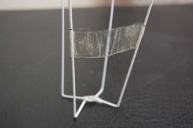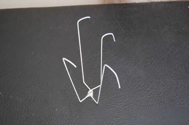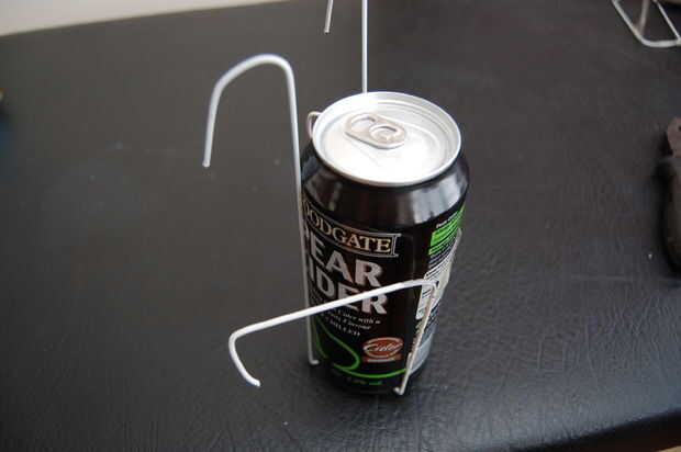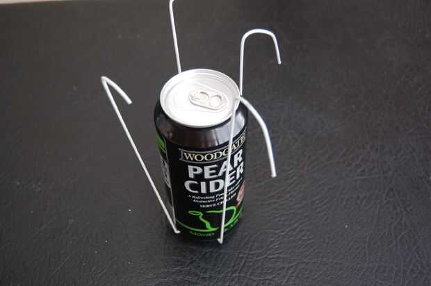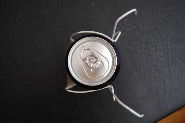 Ahora doble los cables frontales hacia atrás, curvando alrededor de la lata, detrás de los cables traseros y doblarlas hacia delante. Dejarlas que se pega hacia fuera por ahora