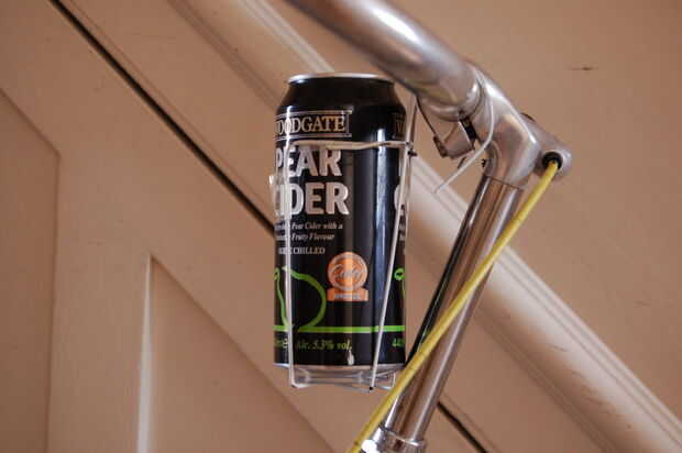 Colgar el soporte, con la lata en su lugar, en el manillar y doblar los cables como se muestra. Si eres feliz que va a quitar y engarce los cables más cortos apretados traseros verticales y cubierta con cinta