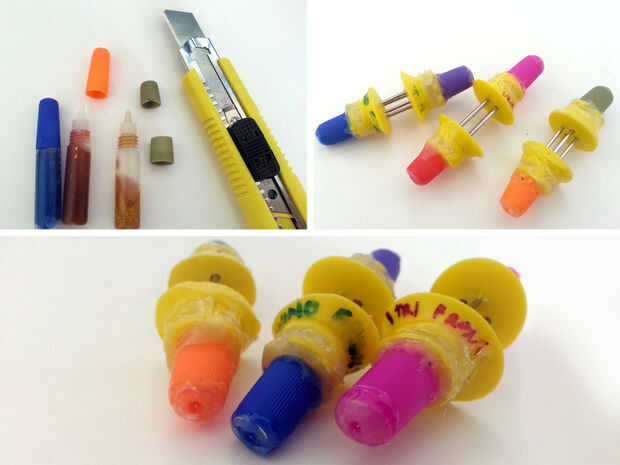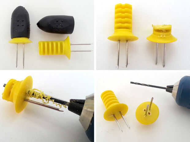 Ya que mi diseño permitió las mitades a juntarse nuevamente cuando no esté en uso, los dientes expuestos necesitan cubiertos asomaba a través de la plástica de la manija. Si izquierda sin cubrir, los dientes sería enterrados y pegados cuando los titulares son en resina. Para solucionar esto, cortar las tapas de algunos pegamento del brillo que encontré en la tienda de dólar. Las tapas eran cortadas a la altura correcta, luego coloca sobre los dientes que resaltan cuando se reunieron los titulares de la mazorca de dos maíz. Pegamento caliente se utilizó para unir las tapas a la parte trasera de los titulares de la cob, y más pegamento fue utilizado para rellenar las aberturas en el plástico donde estaban expuestos los dientes; que cada titular de la cob hermético dentro.