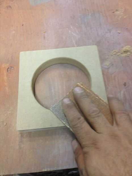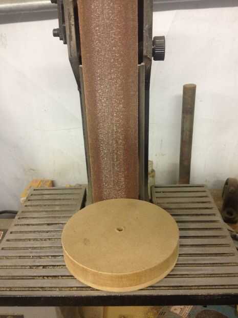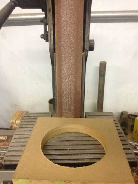 El serrucho no produce un borde perfecto, así que un poco de lijado limpia los bordes ásperos.  Reducir el diámetro de la pieza redonda ayudará, así que no seas tímido con el papel de lija.  Estoy usando una lijadora de banda Banco aquí, pero cualquier método o máquina de lijar lo muy bien.