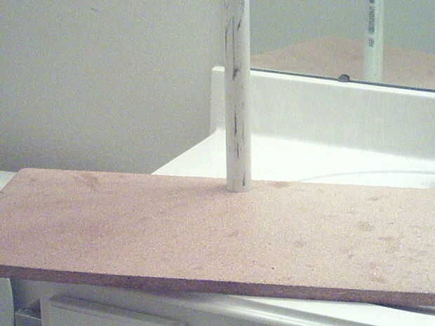 que perforar la totalidad en el medio normalmente, pero en este caso también utilizo la base para mi soporte de taladro de pvc por lo que es a un lado. Así que perfore todo el tamaño de la circunferencia exterior del tubo más fino. desea que esta bastante ajustado. poner una cantidad mínima de pegamento en la madera donde se ajusta el tubo en y en ese extremo del tubo va en el agujero. Puede elevar la base para que el pegamento no filtra hacia fuera y la placa se pega a lo que está en. Dar tiempo para perforar bien.