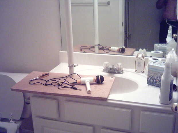 una vez en casa de un amigo para grabar batería, me di cuenta en el último momento me faltaba el soporte para uno de mis gastos.  Justo cuando comenzó concediendo a la idea de posponer, tuve un eureka momento.  Cinta del conducto puede arreglarlo.Aqu