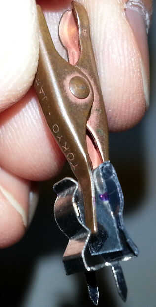 Ponga la lata corta sobre la cinta con el hombro de la lata de pulsar en la parte superior del clip y en lugar con pinza pequeña. Uso fieltro marcador para marcar la lata donde cubre la porción curvada del clip de fusible. Extraiga la bandeja y extender esta marca a la parte lijada de la lata.