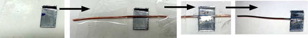 Lata del lugar, arena hacia arriba, en doble cara cinta sobre una superficie plana, establecer alambre de cobre sobre la marca en estaño y cinta con cinta regular. Nota sólo una pequeña superposición del cable es deseada en el lado derecho. Soldar el cable a la lata, retire la cinta, corte el exceso de cable en el lado derecho.