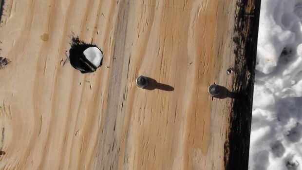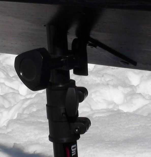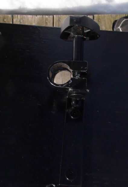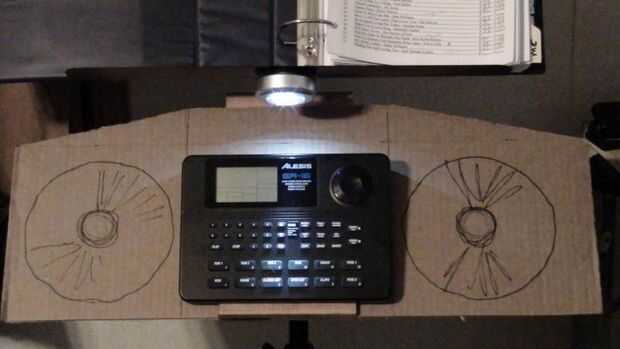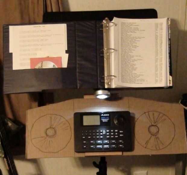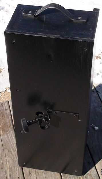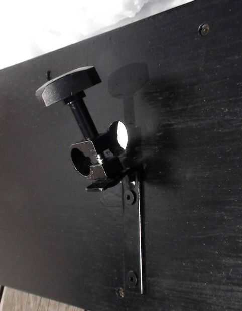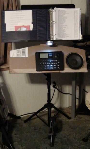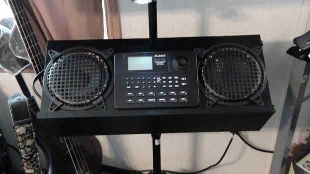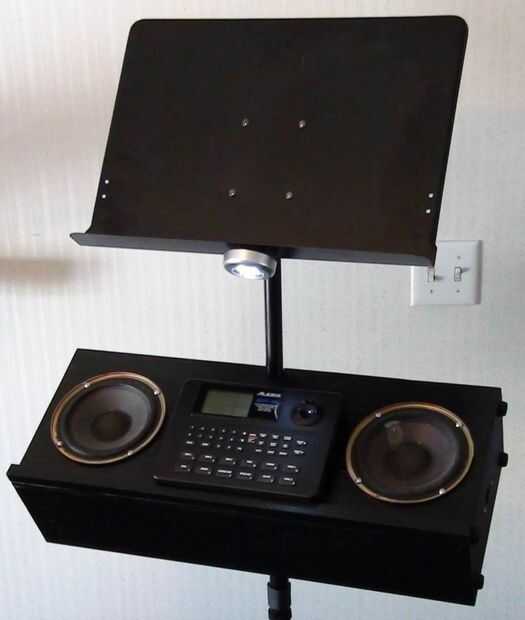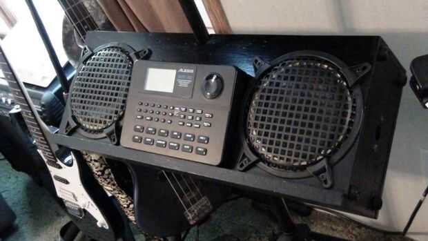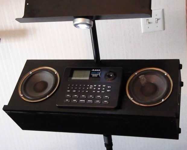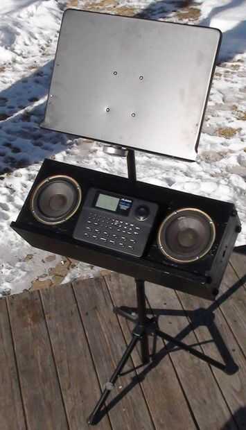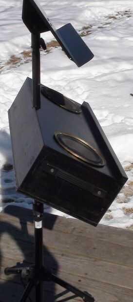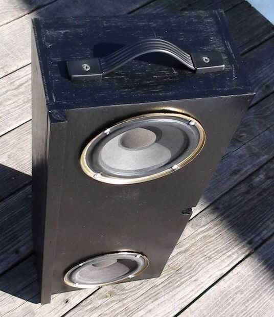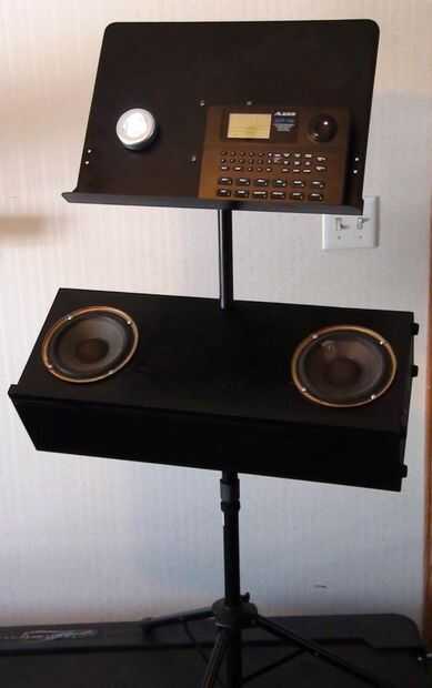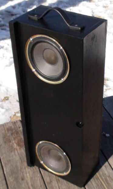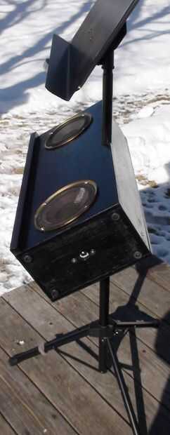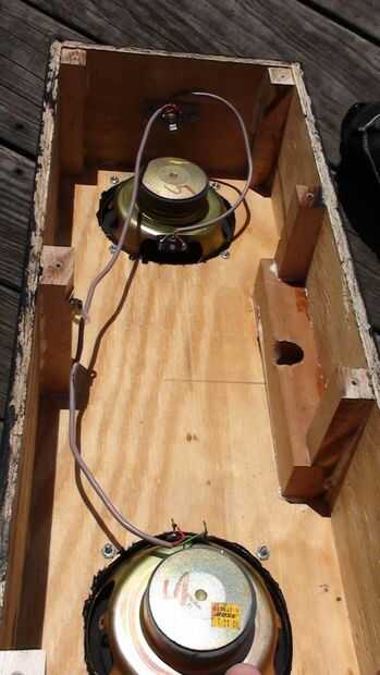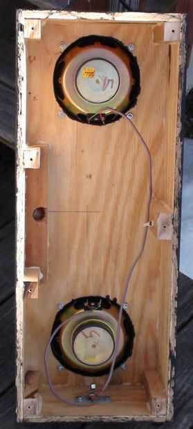 Los altavoces 6.5" diámetro son un viejo estante de Bose que retiró el MDF de altavoz original (los tweeters se soplado) he tenido ahí desde hace algún tiempo. Es una simple caja de que Richard y me hecho de madera contrachapada gruesa de 0.5". El bloque de madera de interiores centro superior es madera para evitar partir el peso sobre el atril. La caja está en un ángulo de 30 grados y originalmente hecho girar libremente alrededor en el stand así que Richard pone una pinza de compresión y perilla estriada en la parte posterior de la caja que permite también la caja para fijarse a cualquier altura sobre el soporte en lugar de establecer sólo en las gradas de la mitad inferior. No se intentó averiguar dimensiones recinto 'correcta', pero suena bastante bien! Uno de los cuadros muestra altavoz cableado de que va reemplazando con alambre de calibre más pesado de la misma longitud en ambos altavoces.