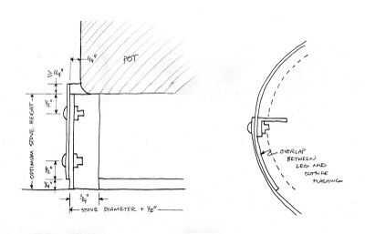 c) calcular la altura del parabrisas y corte = agregué 1/4" labio encima del soporte de pierna para abrazar el borde inferior de la olla. Agregar más aumentaría la eficiencia, pero usted debe tener en cuenta el mango como bajo es a los lados del bote y la altura total debe ser menor que la profundidad de la maceta para colocar el soporte de olla-parabrisas dentro del recipiente para el transporte. El parpadeo del corte con unas tijeras funcionó bastante bien.