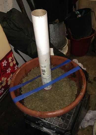 Usted necesitará el tubo en la jardinera del centro y asegúrela. Usé algunas cintas. No necesita ser super segura porque una vez que se agrega concreto, se sostenerse erguido y puede quitar la cinta.