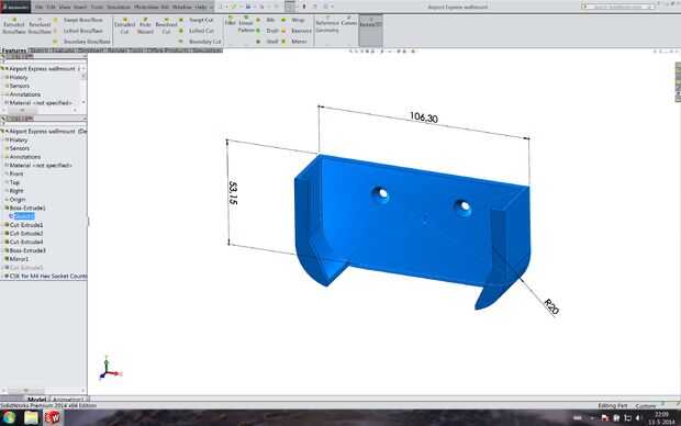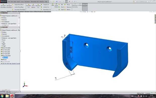 Todas las mediciones fueron convertidos en un modelo CAD con SolidWorks (cualquier otro CAD software de modelado debe funcionar). Impresiones de prueba de una pequeña parte de la pared fueron hechas y medidos. Ajustaron a la diferencia de dimensiones entre las impresiones de prueba y modelo de CAD de Solidworks. La impresión final se hizo con un espesor de capa de 0,2 mm (con una boquilla de 0,5 mm), dando el soporte un perfecto acabado. Para una mejor adherencia a la cama de impresión, un borde de 4 mm fue agregado en el software de impresión.