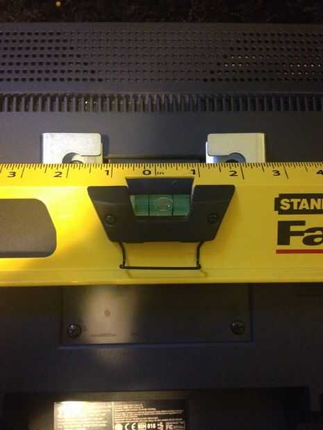 A continuación tienes que encontrar el centro, con mi nivel que he podido encontrar un número común que estaba sentado en la misma ubicación en ambos soportes, utilicé 1" 7/8 bruja sat 1/8" en desde el centro de los soportes para que tuvieran un poco de juego al moverse la pantalla para ajustar la ubicación del centro sobre mi monitor principal cuando está en la pared.
