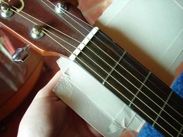 Tome un pedazo de papel o cartón y medir la parte superior del cuello de la guitarra.