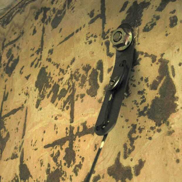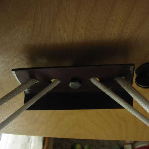 Para hacer la plataforma soporte la carga utiliza un cable de metal (es muy fuerte y fino, casi invisible, especialmente en estos cuadros pequeños). Un extremo de ella se une a la pared con un tornillo de pared y una pieza de metal. El otro extremo pasa por un agujero en el estante y se aferró firmemente entre monedas perforadas que permiten el ajuste de la plataforma.