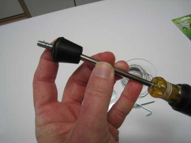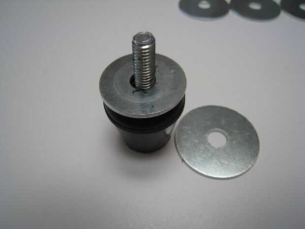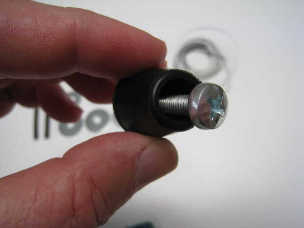Inserte los pernos en las puntas de goma. Si compraste los pernos con cabeza grandes como yo lo hice, utilice el destornillador Phillips para asentar la cabeza del tornillo en la punta de goma. Agregue uno de sus arandelas de defensa a cada una de las puntas de goma con el perno sobresale. Dejar de lado las otras arandelas 4 fender por ahora.