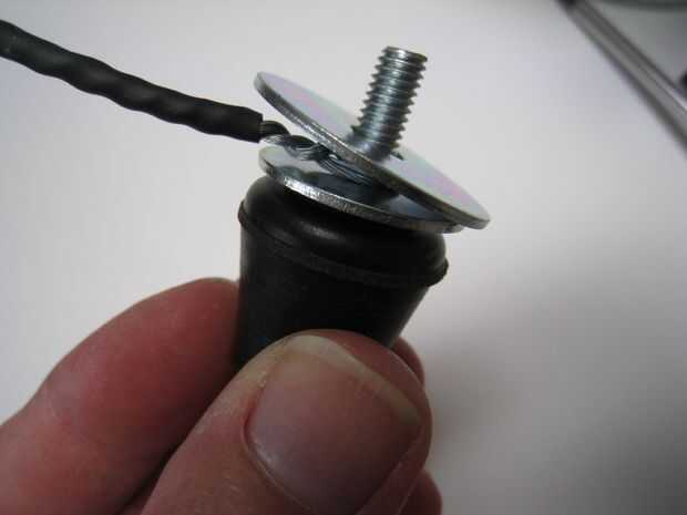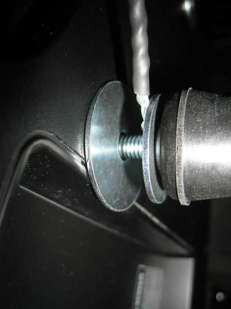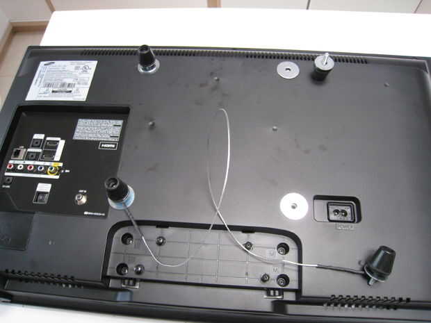 Una vez que todos los pernos y arandelas de doble han sido parcialmente atornilladas en la TV orificios de los tornillos, coloque el cable entre los dos arandela en cada perno. Esto ayuda a "pellizcar" les al alambre cuando Haz apretados para arriba.