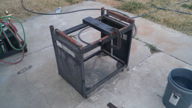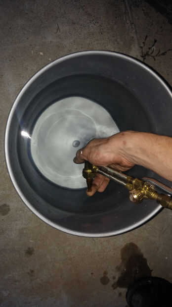 Para cortar este material he utilizado dos métodos. El canal más grueso se cortó con un soplete de acetileno de buey. Si decides utilizar este método, no escatima en medidas de seguridad. Siempre pruebe el equipo para fugas antes de encender la antorcha. Me gusta usar un balde de agua. La antorcha entera (y mangueras) pueden ser sumergidas - burbujas indican una fuga. El cubo de agua también es útil para tener todo en el caso de chispas se convierten en un problema. Siempre asegúrese que la manguera y listo para ir. Antes de iniciar el corte, la pieza de la abrazadera hacia abajo (utilicé un viejo esqueleto de parrilla). Después de la iluminación de la antorcha y el ajuste de la llama, hacer el corte. (Que es una foto mía haciendo el corte - fue absolutamente espectacular - estoy seguro de que los vecinos me encantan).