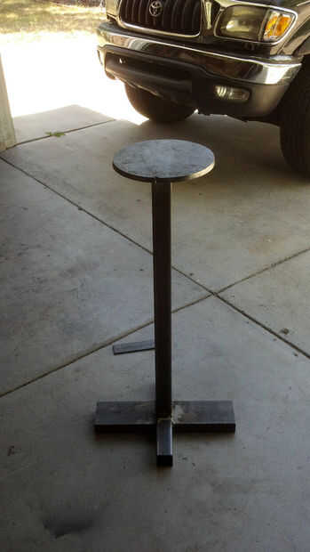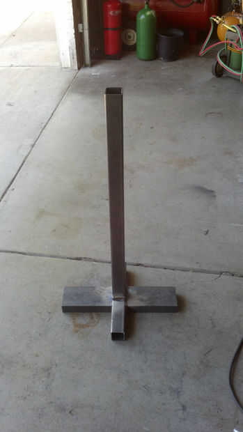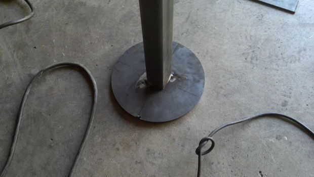 A continuación poner el trozo largo de tubo cuadrado en el centro de la base. Encontrar el centro de la pieza más corta de tubo cuadrado y mide una pulgada por encima y por debajo. Virar el trozo largo de tubo cuadrado y asegurar que está recto y nivelado. Soldar con autógena el tubo. Luego de la escoria y limpiar las soldaduras con una rueda de alambre.