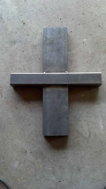 Coloque las dos piezas de la canal y la pieza más corta de tubo cuadrado hacia fuera en un patrón cruzado con tubo cuadrado en el medio y un trozo de canal a cada lado. Virar las piezas juntas y comprobar nivel. Luego voltear la pieza y agregar cuatro tachuelas más en la parte posterior. Asegúrese de virar su pedazo bien porque pobre tachuelas pueden cambiar de la rotura durante la soldadura que le da problemas más tarde. Después de que la pieza se viró, soldar la base juntos. Luego de la escoria y limpiar las soldaduras con una rueda de alambre.