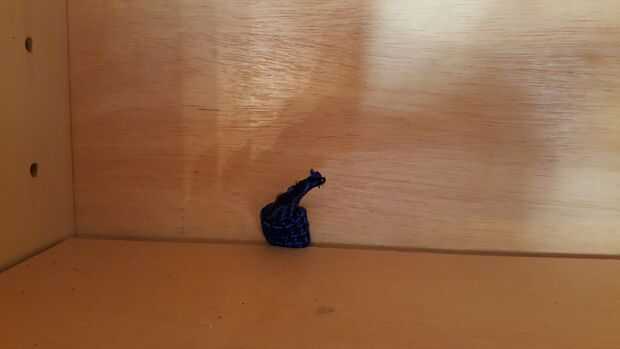Tenga cuidado de hacer esto - vaciar el estante primero. Inclínela hacia usted y coloque los pasadores de goma cuidadosamente - hizo un ajuste muy apretado para mí. Desea que la parte superior plana del bungee gancho al ras contra el fondo del gabinete y el nudo apretado en la parte superior, por lo que no mueve o movimiento de los ganchos, una vez en el lugar. Cuando devuelva los productos en el estante, ayudará a sujetar más firmemente.