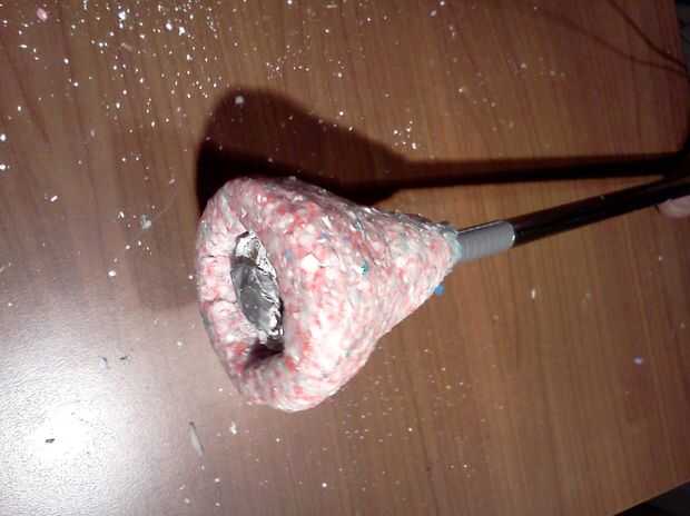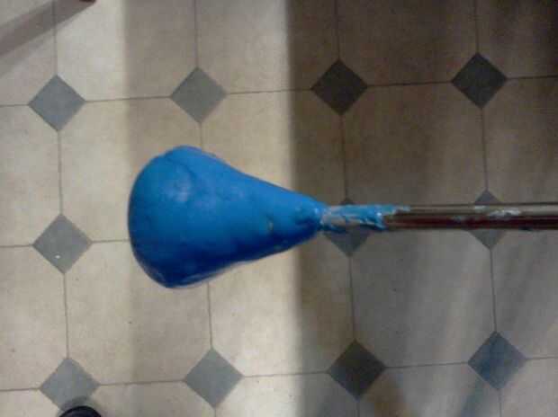 Con facilidad una manija que es seguro (no se deslizará fuera de la varilla) y fácil de hacer vuelva a utilizar oogoo. Para hacer el mango necesitamos mucha oogoo y vale la pena considerar reciclaje desechos oogoo que usted podría haberse acumulado. De hecho, os habréis fijado que un montón de desechos de caucho permanece en sus tazas, cucharas, mezcla palo, guantes y tabla cuando prepare oogoo. Puede reciclar todo este material que recoge y molerlo y utilice el polvo resultante del"" para hacer reciclado oogoo añadiendo un poco de sellador de silicona pura y almidón de maíz. Para una descripción detallada de cómo reciclar oogoo ver mi oogoo de"reciclar" instructable. Si no te importa usar gran cantidad de calafateo de silicona ignorar lo que dije arriba e ir haciendo tanta oogoo fresco como usted va a necesitar para hacer el mango. Sin embargo Observe en las siguientes fotos que usé "reciclado oogoo", que tiene una textura granulada en vez de la habitual textura homogénea de oogoo normal. Sólo para la capa final del mango usé oogoo fresco color azul.