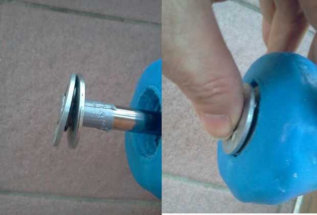 -corte un disco circular en la parte superior del mango, siguiendo una trayectoria circular con un diámetro más pequeño unos 5-8 mm que el diámetro de la arandela. Esto es muy importante! No corte demasiado grande. Un disco bastante pequeño recorte permitirá la lavadora seguirá sujeta dentro de la manija.