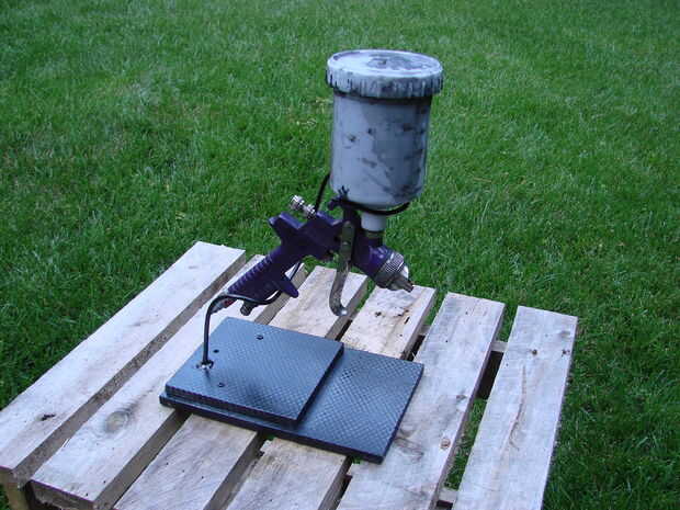 pintura una motocicleta es un desafío en sí mismo retos adicionales son no deseados. Un absoluto "must-have" para este proceso desordenado es un soporte de pistola. Lo que lo más probable es que se olvidó de comprar cuando usted pidió que suministra la pintura era sólo eso - algo que sostenga la pistola cuando se cargan con pintura y un lugar para descansar el arma entre las capas. Con mi billetera, ya empobrecido por mi actual proyecto de restauración de motos, he hecho mi propia de un acero de 3/16" varilla y madera contrachapada que tuve en mi pila de descartes de proyectos anteriores. Probé mi mano en un acabado de imitación de fibra de carbono sobre la base simplemente porque me gusta el look de fibra de carbono.