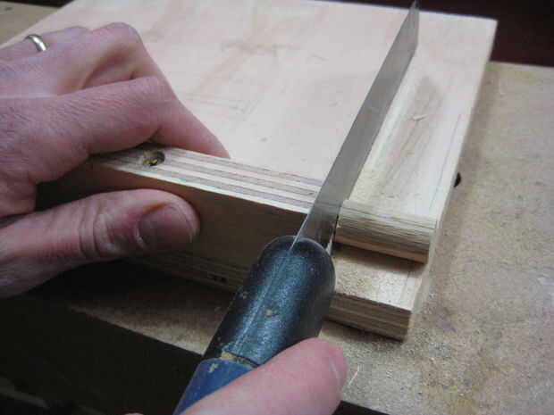 usé un gancho de banco para cortar las piernas.  Me Deslice el pasador al borde del gancho de banco y coloque la sierra contra la guía.