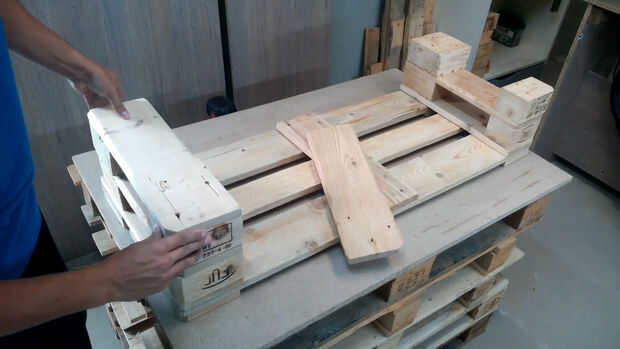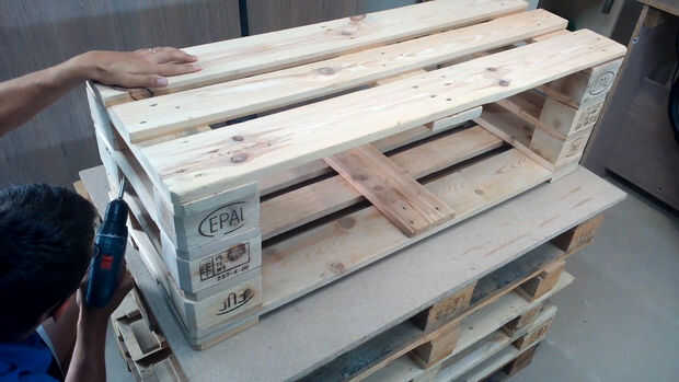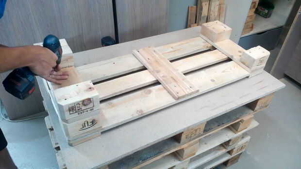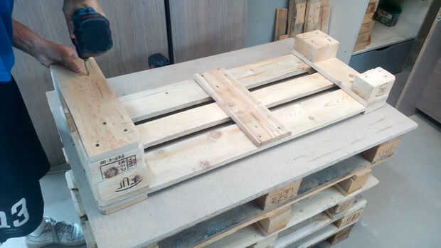 Hizo una nueva capa con plataforma dados y tablero adicional. Atornillado junta a los cubos, y esta pieza fue volteada y atornillada en el lugar. Utilicé tornillos de madera de 50mm y atornillados, en ángulo de 45 grados. Luego perfore se necesitaba demasiado.