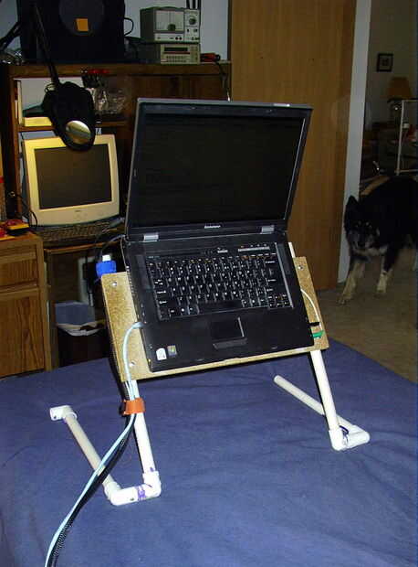 Esta parte puede realizarse mientras se establecen con el soporte sobre ti. Uso de las marcas de anchura del ordenador portátil de la Junta, ajuste la altura de portátil donde llenan más cómodos y conecte el portátil a la Junta. Teóricamente, se alinean las piezas de Velcro. Ajusté mi portátil por lo que mi vientre borra y permite mis brazos mentir en la cama con mis manos en las teclas.