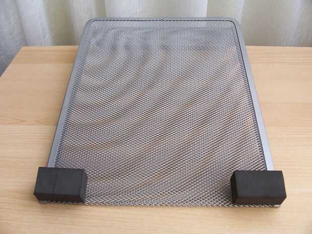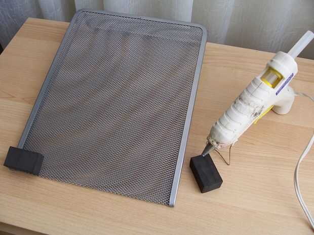 Usar una pistola de pegamento, pegar cada pieza en la esquina de Metal portadocumentos (pegamento en el borde doblado). Esto evitará que el portátil resbale cuando se está sentado en un ángulo.