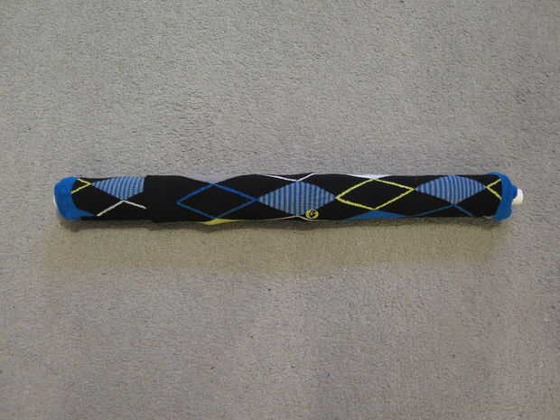 Yo estaba preocupado por la posibilidad de espuma pegado a un ukelele después de contacto prolongado. Pensé en coser un tubo de la tela se deslice sobre la espuma, pero un amigo mío tenía una idea aún mejor: los calcetines! Los calcetines usé eran tres pares por $7 en Marshalls. Son calcetines de tubo más o menos; hay un poco de tacón, pero es sutil. Cada calcetín estaba sobre un pie de largo (ver lo que hice allí?) sin estirar, por lo que dos son suficiente para cubrir mis rieles.