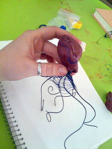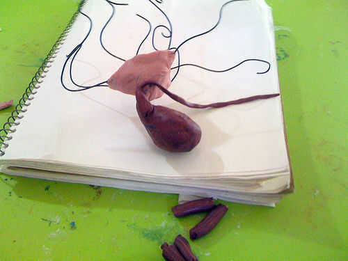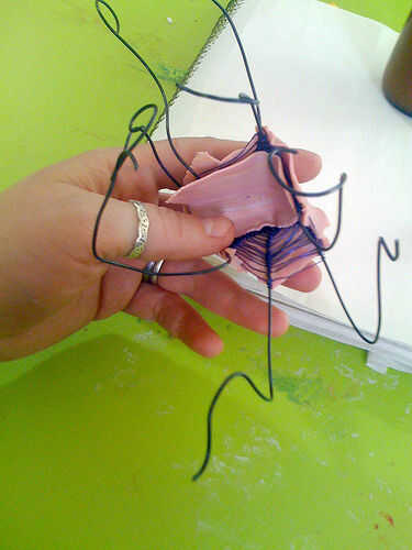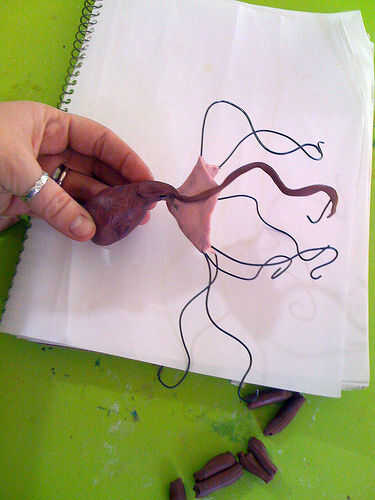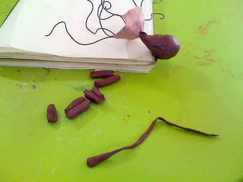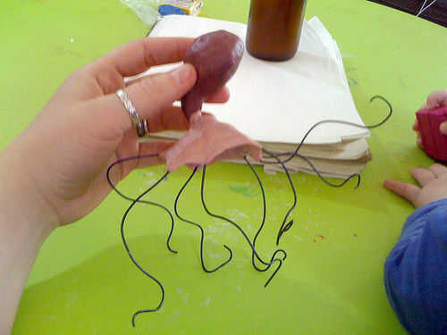 Extienda el ocho piezas largas y delgadas de masa. Conecte el extremo grueso de las serpientes de masa al cuerpo y la longitud de ellos alrededor de cada cable de prensa.